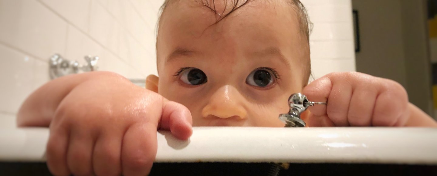 Suddenly, as I sat down on the cold bathroom tiles to dry Stella off, a giant splash erupted from the tub with a massive metallic thud. It was a worrying thud. The sort of thud that might be made, for example, when a 15-month-old boy’s face strikes a slab of cast iron.