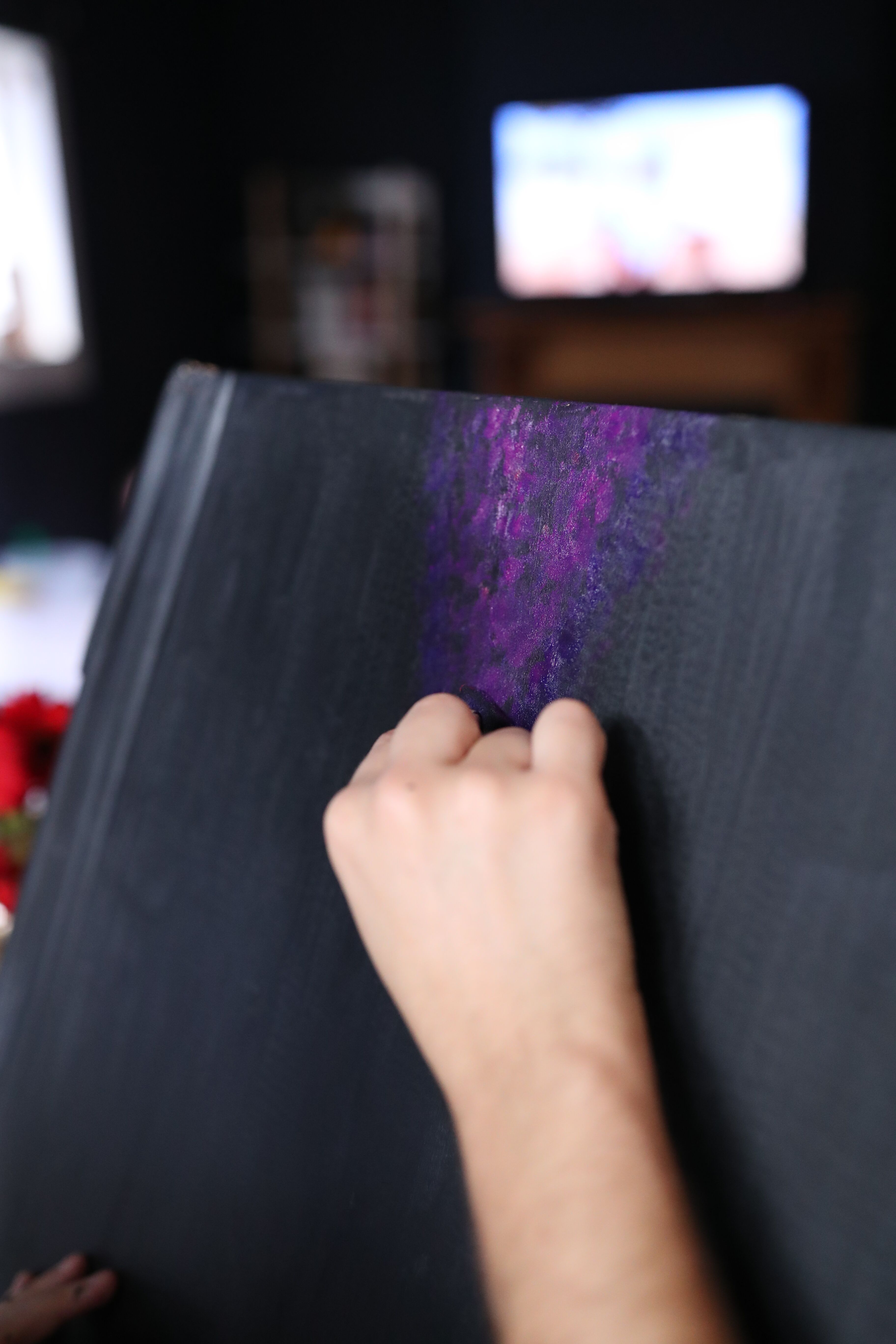 Step 4: Paint your galaxy. The best way to do this is to layer on colours from dark to light using a sponge. I have a bunch pre-cut from previous projects, but you can literally hack away at a kitchen sponge if you’d like. If you’re new to this technique, I’d suggest you Google photos of galaxies and attempt to replicate the patterns you find. I prefer creating my own designs by thinking of the black paint as land and the new colours I’m adding as river canals. Lay down your dark purple or blues as the edges of your river first, creating a path that cuts through the land. Then take your lighter colours and add on thinner layers to the inner edges of each “river”, making each canal pop.