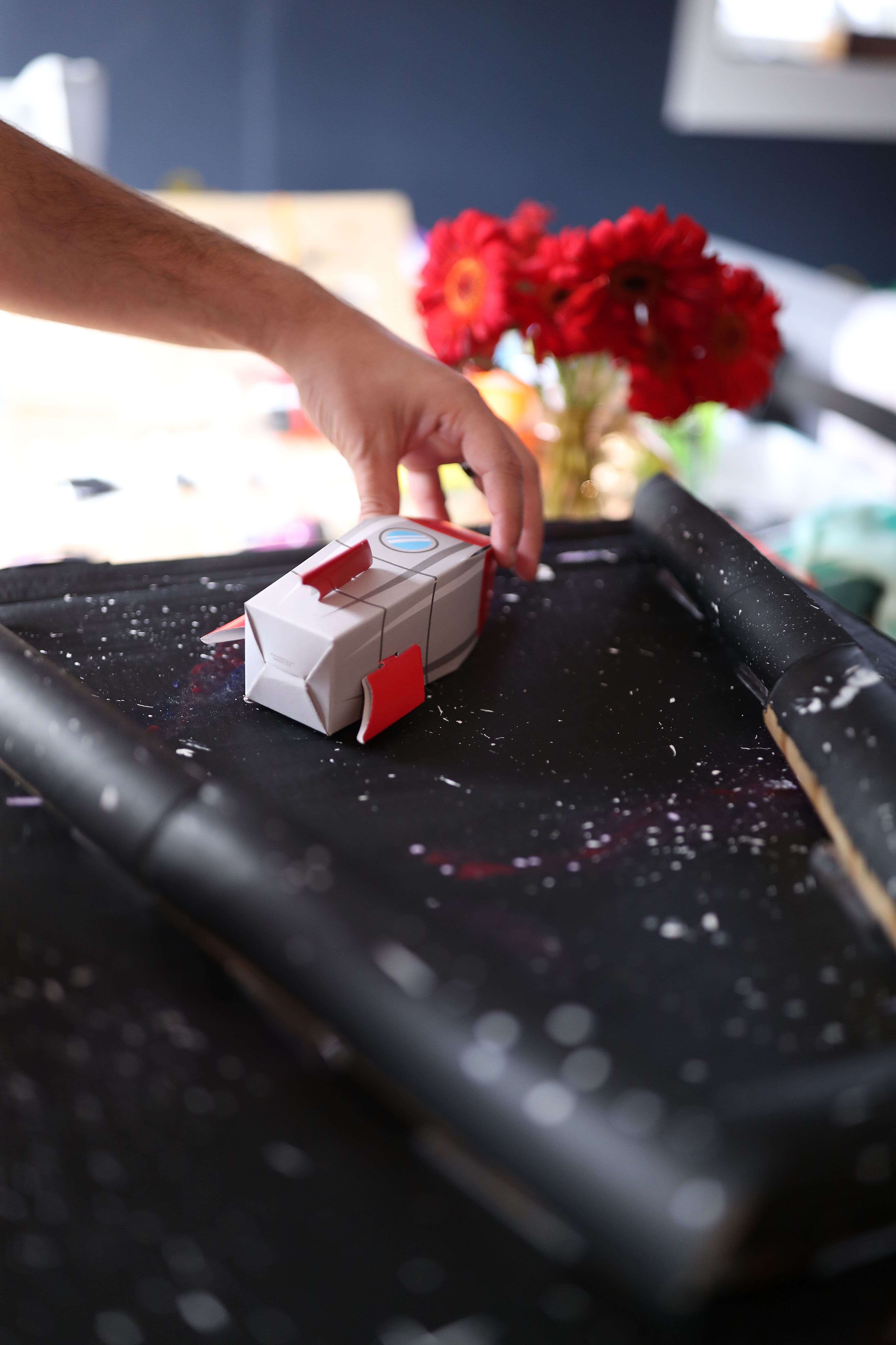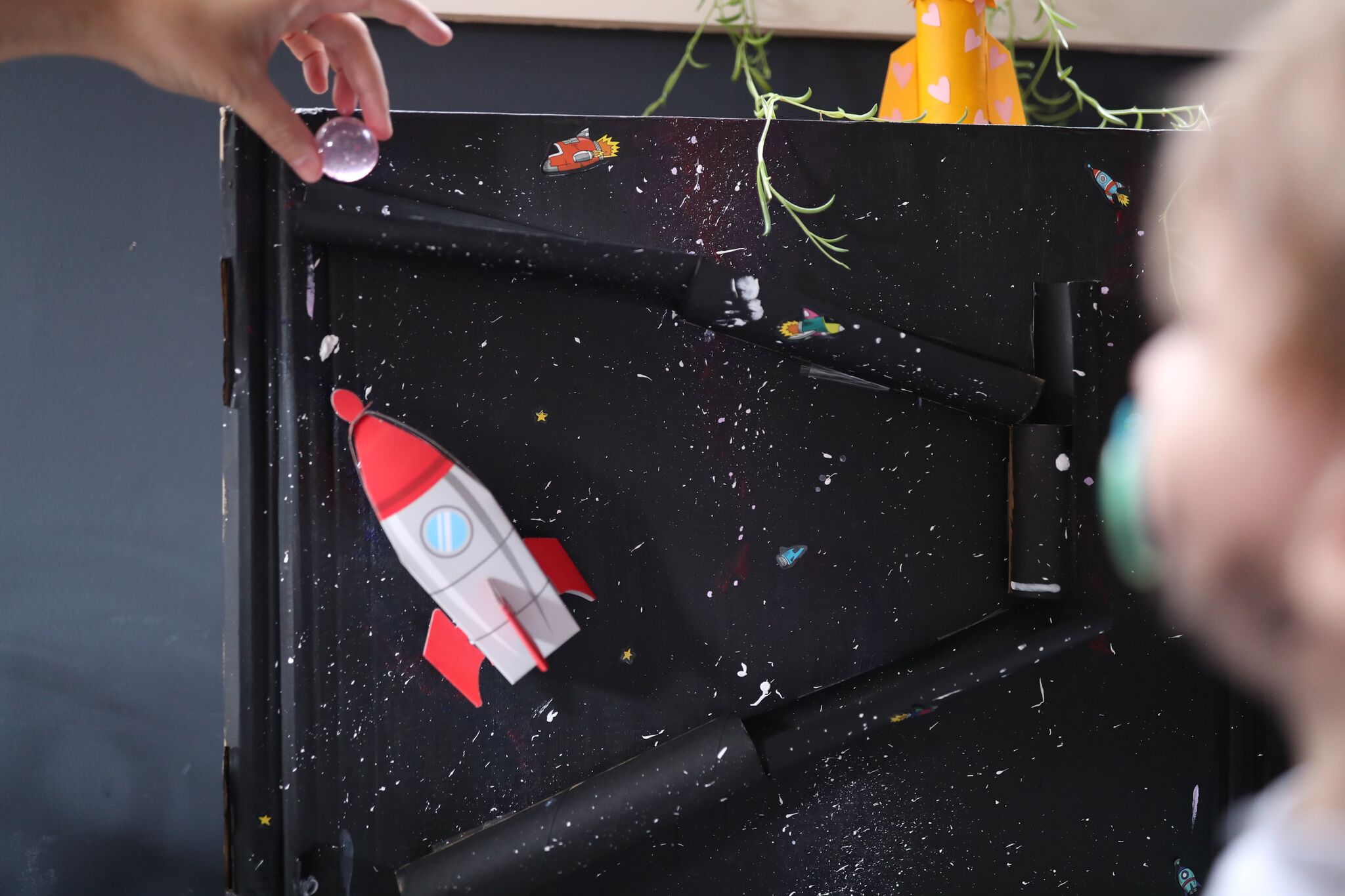 Step 10: Add your stickers and any space-themed objects you have around the house. I had a rocket ship “goodie bag” from a birthday party, so I taped that on for a pop of colour.
