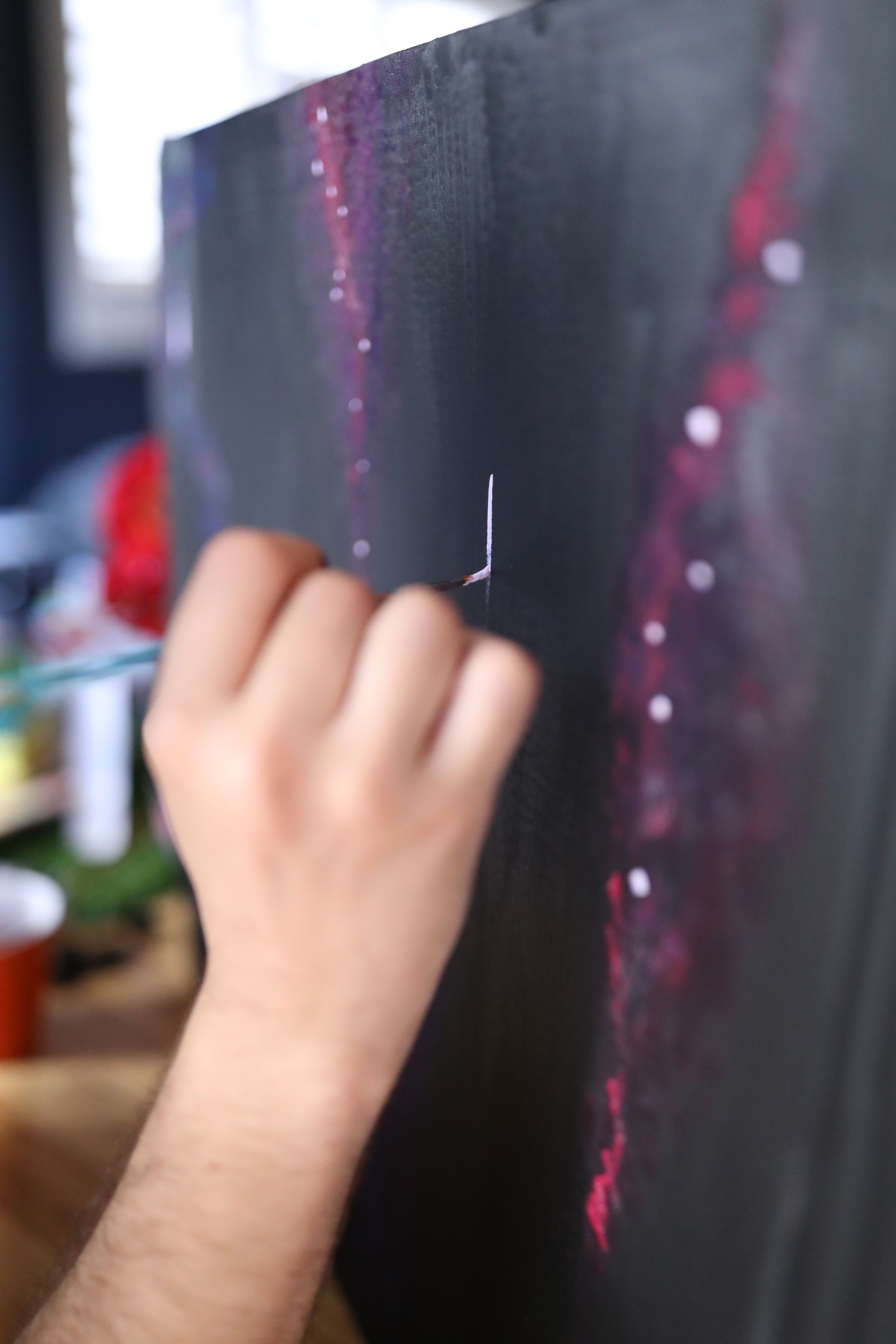 Step 6: Before moving onto Step 7, which will be the most fun you’ll have all week, I like to go in with a small brush and paint on some larger white stars and throw in some shooting stars if you’re feeling wild. You won’t be able to guarantee these with the splatter paint technique, so you’ll appreciate this step when the project is complete.